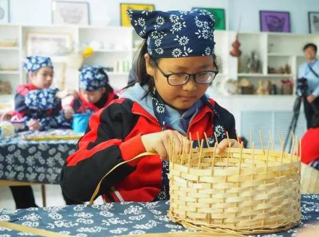 孩子们在校园中学习柳编技艺。《齐鲁晚报》齐鲁壹点