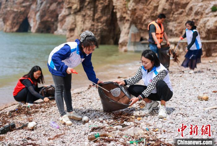 志愿者对海岛周边岸滩的海洋漂浮物进行清理。中新网