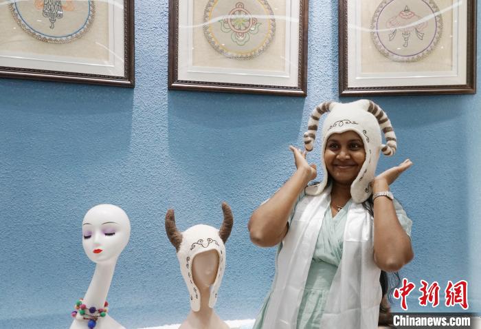 6月11日至16日,来自南亚、加勒比和中南美洲地区的14个国家的16名海外记者走进中国青海,围绕生态保护、清洁能源、多元文化、民生改善等主题实地采访,用镜头向世界讲述中国式现代化在青海的生动实践故事。在为期一周的行程中,记者们先后去往青海大学、撒拉尔故里民俗文化园、青海湖湿地自然保护区、龙羊峡水光互补发电站等地,并参加第三届中国(青海)国际生态博览会及“与江源和谐共生”2023生态文明国际交流合作论坛。 6月13日,记者团到访青绣数字化经济总部,观赏精美青绣产品,并在绣娘们的帮助下体验制作,感受土族盘绣、贵南藏绣、河湟刺绣等非遗文化魅力。图为一名外籍记者佩戴创新的蒙古族毡帽。