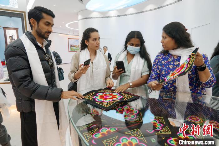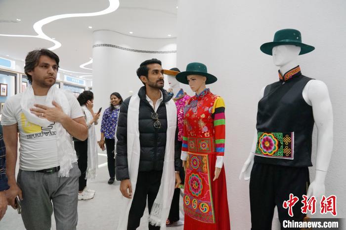青海民间传统刺绣简称“青绣”。“青绣”历史悠久,手法独特,品类丰富,针法繁多,色彩艳丽,应用广泛,是青海各族妇女世代传承的民间手工艺。现已成为青海代表性文化符号。图为记者团在青海青绣数字化经济总部观赏青海民族服饰。