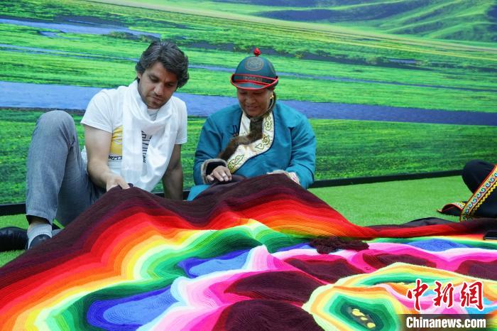 在青海青绣数字化经济总部,一名外籍记者(左)和绣娘学习土族盘绣技艺。