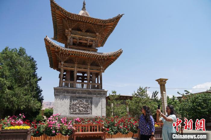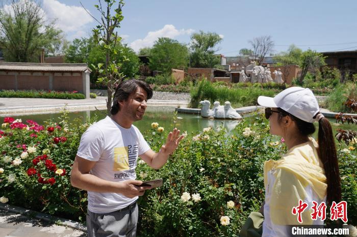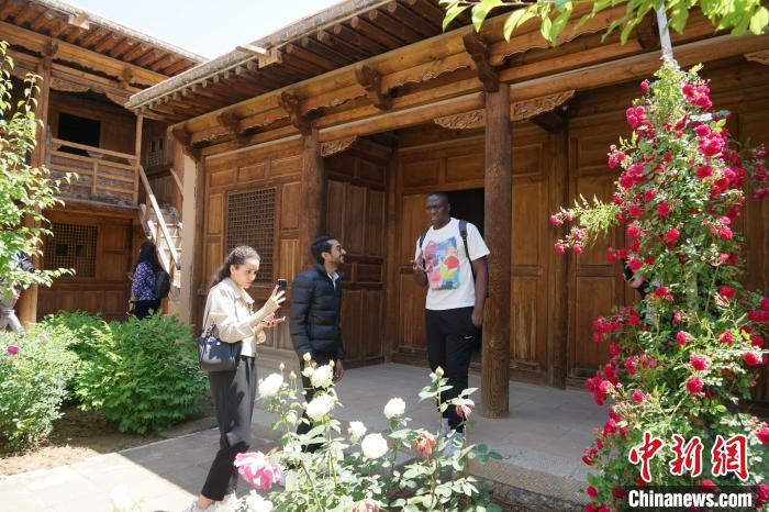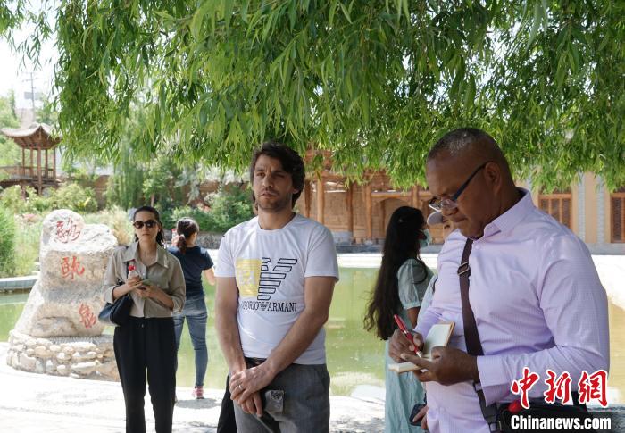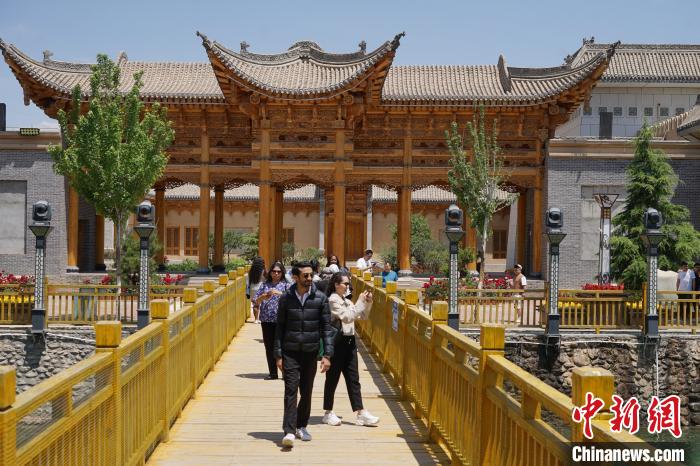 6月13日,十四国记者来到青海省东部黄河岸畔的中国唯一撒拉族自治县循化县,在撒拉尔故里民俗文化园和地标性景区骆驼泉中参观撒拉族传统建筑、庭院,了解当地历史文化。图为记者团在撒拉尔故里民俗文化园参观撒拉族传统建筑、庭院。