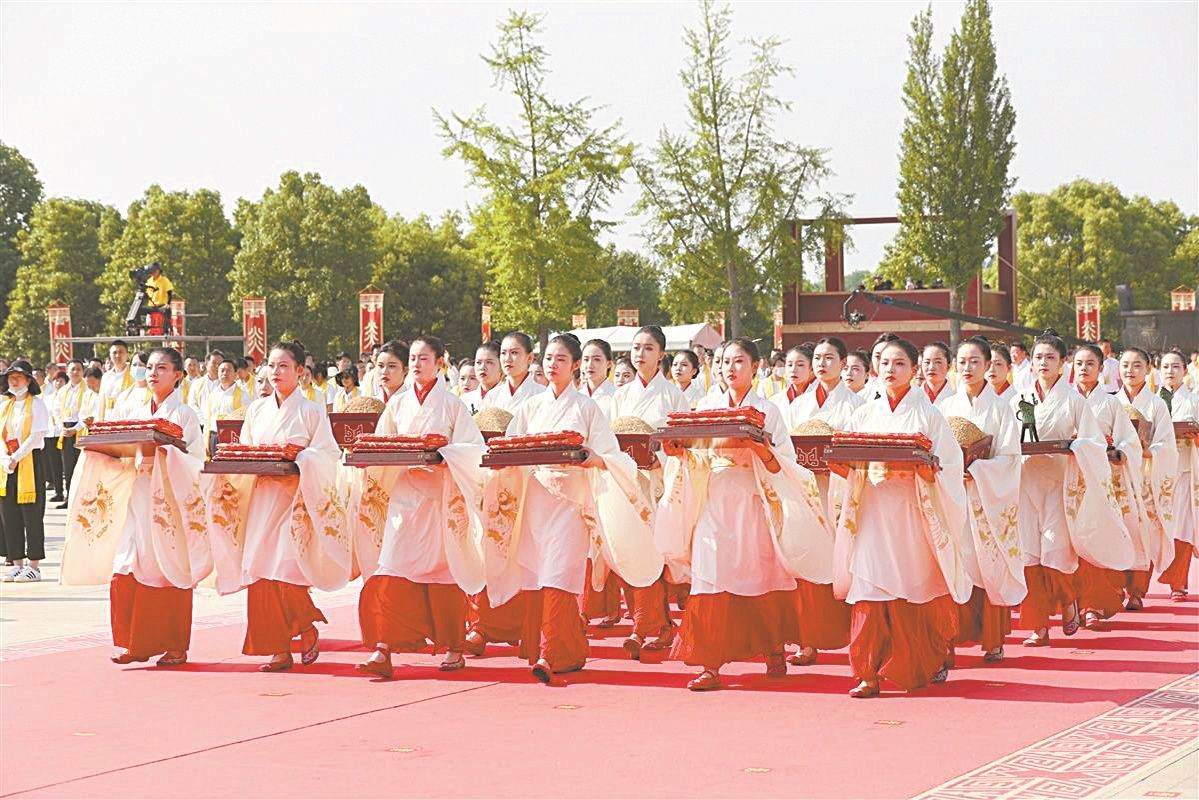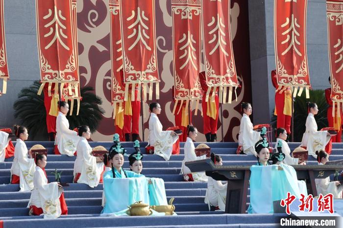 礼仪人员手捧五谷、布匹等。《楚天都市报》