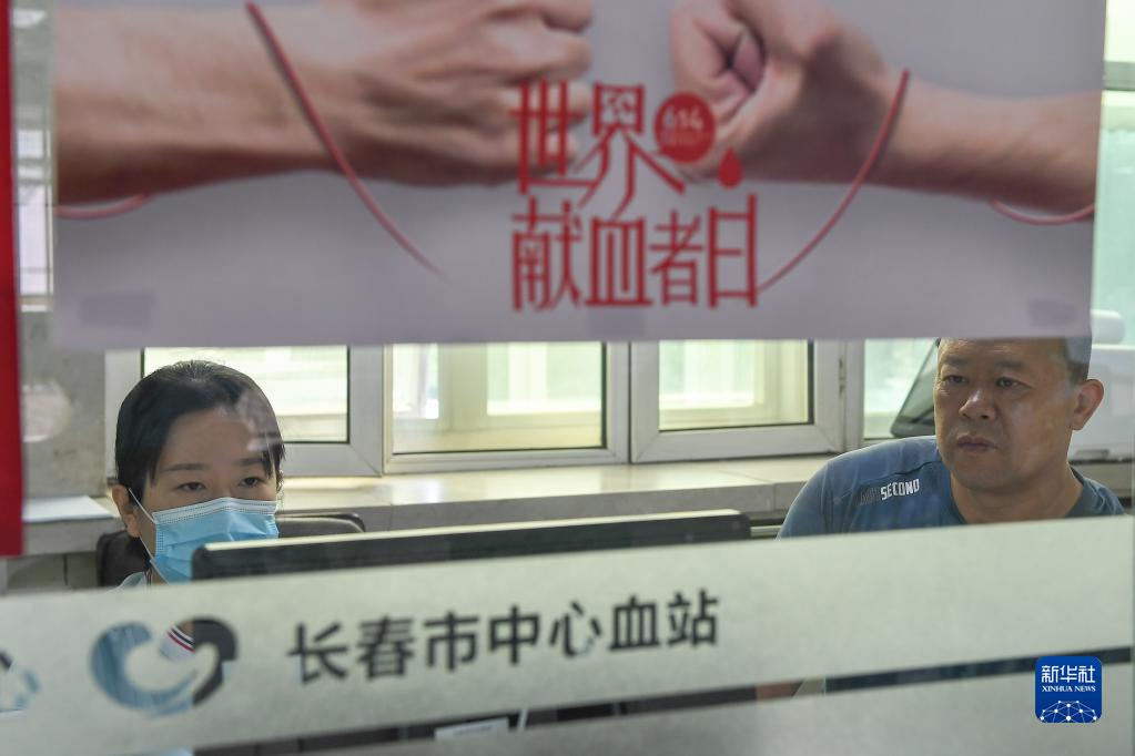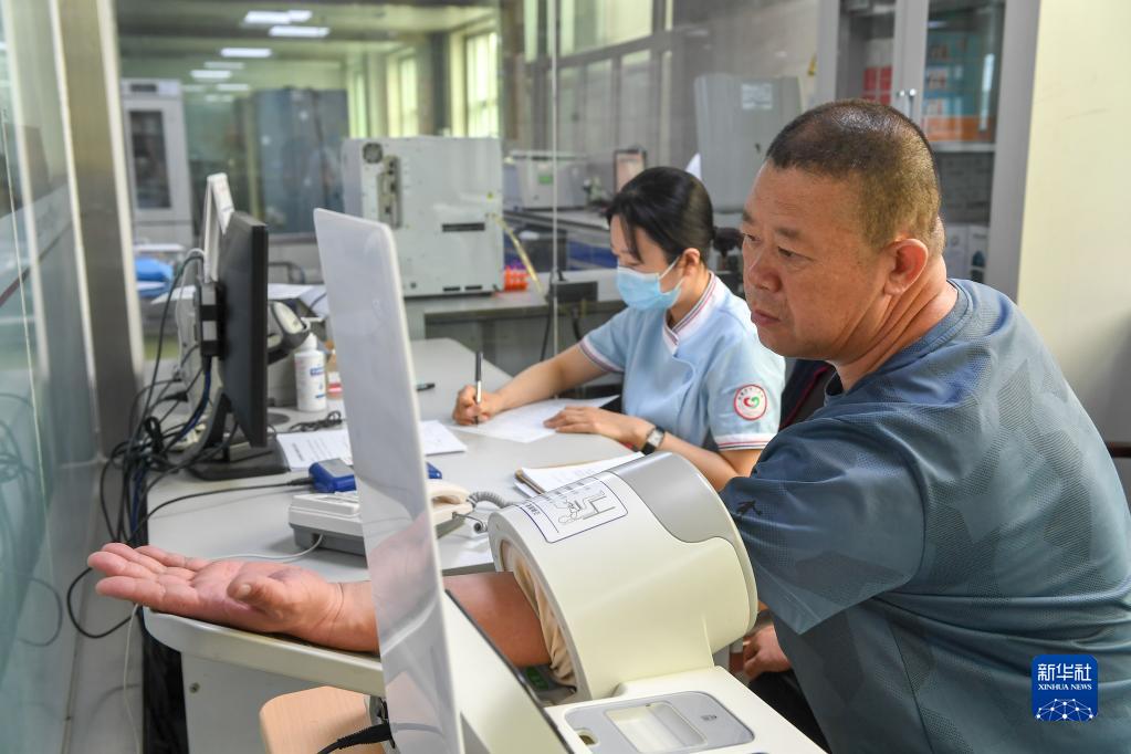 有这样一群无偿献血志愿者,他们的血型是罕见的RH阴性。因为在人群中数量少,RH阴性血被称为“熊猫血”,RH阴性血无偿献血志愿者被称为“熊猫侠”。图为6月13日,在长春市中心血站,RH阴性血无偿献血志愿者王文东(右)在献血前检查身体。新华社