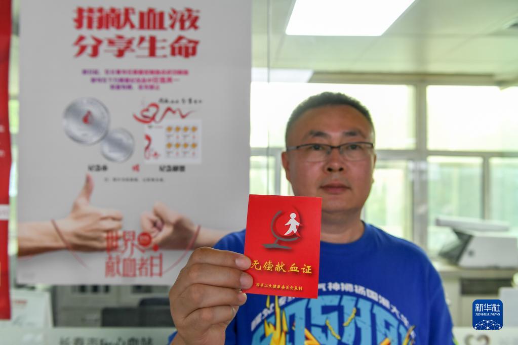 十余年来,借助组织无偿献血宣传活动和通过媒体号召,吉林省长春市中心血站吸纳了上千名RH阴性血无偿献血志愿者。这些“熊猫侠”会不定期进行无偿献血,在接到紧急用血求助时,他们第一时间“挽袖相助”,为挽救生命奉献自己的力量。图为6月13日,在长春市中心血站,RH阴性血无偿献血志愿者李扬帆展示无偿献血证。新华社