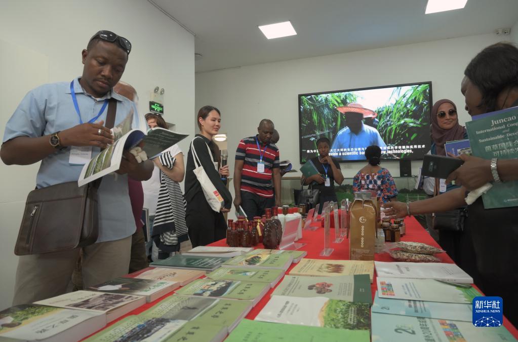 参加第十八届国际菌草产业发展研讨会的代表们在位于福建农林大学的中国国家菌草工程技术研究中心了解菌草种植技术资料及深加工产品。新华社