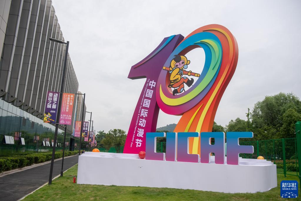 在第十九届中国国际动漫节主会场杭州白马湖国际会展中心旁竖立的主题雕塑(6月20日摄)。新华社