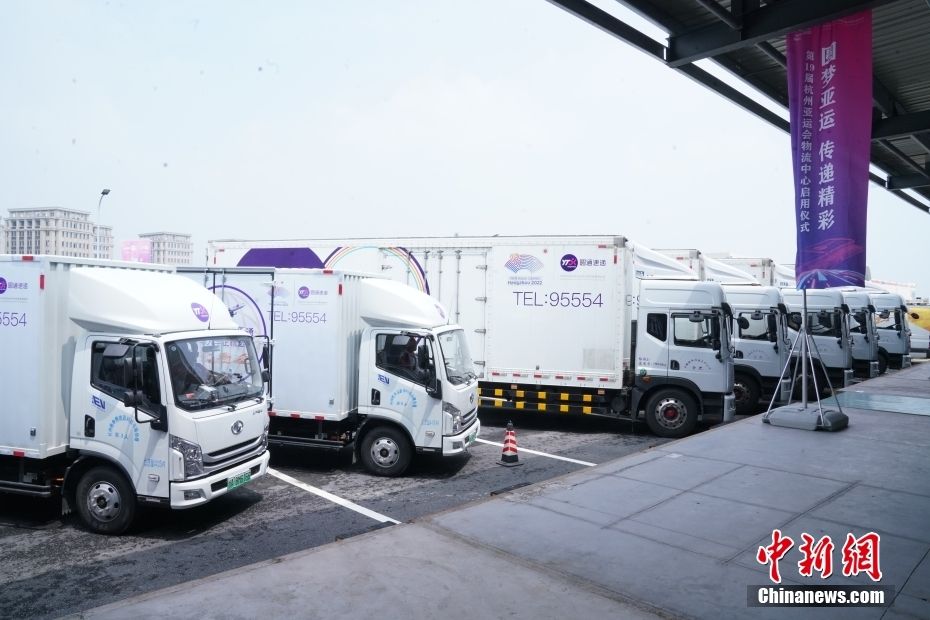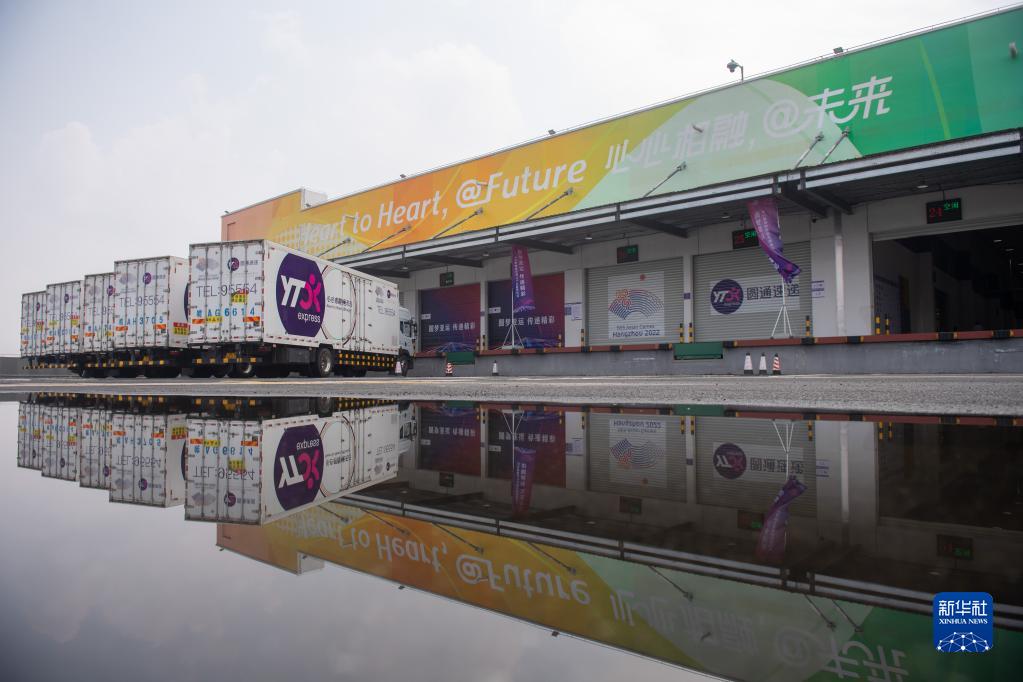 亚运干线车满载货物等待出发运送杭州亚运会首笔出库订单。中新网