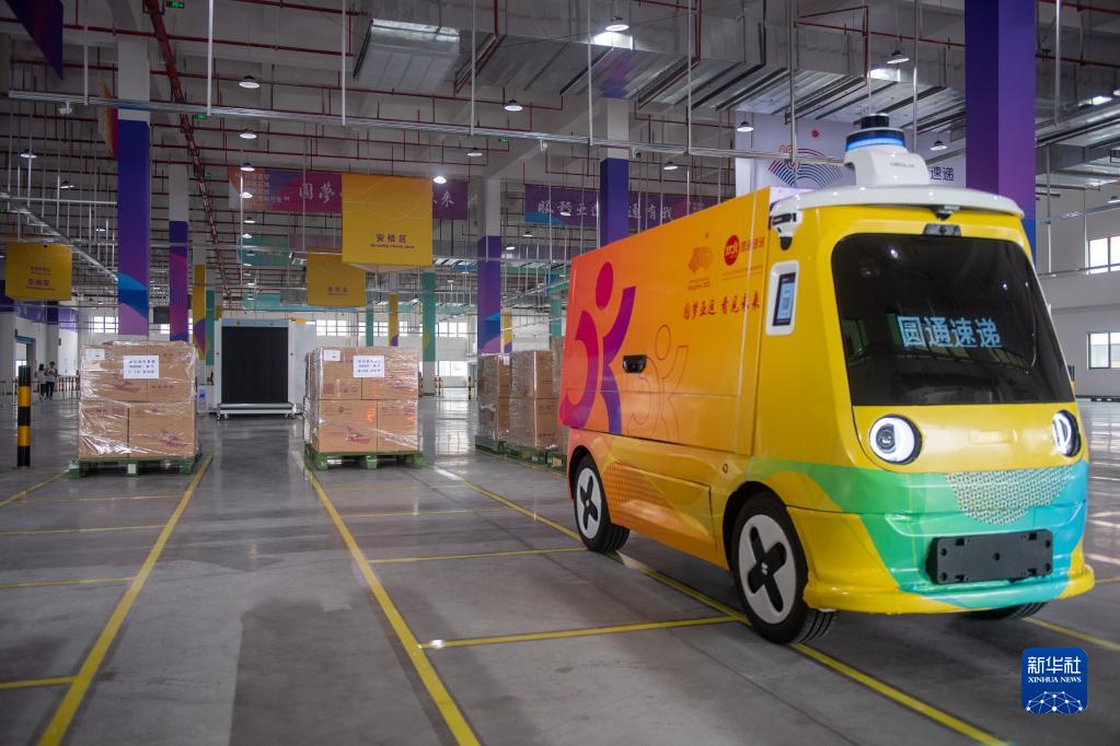 物流中心全部使用新能源车辆,全仓采用无纸化作业,从仓储配件到包装纸箱,均采用绿色可循环材料。屋顶建有光伏发电项目,可充分满足物流中心自身用电需求,相当于减少二氧化碳排放1032吨。图为无人车在第19届杭州亚运会物流中心内转运包裹。新华社