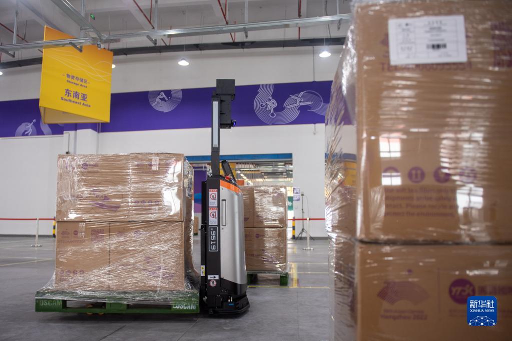 目前亚运会物流中心团队已经跟海外20多个参赛国家和地区的代表团进行了对接,预计在未来的2~3个月内,各代表团的物资将会集中到达杭州。图为自动叉车在第19届杭州亚运会物流中心内搬运包裹。新华社