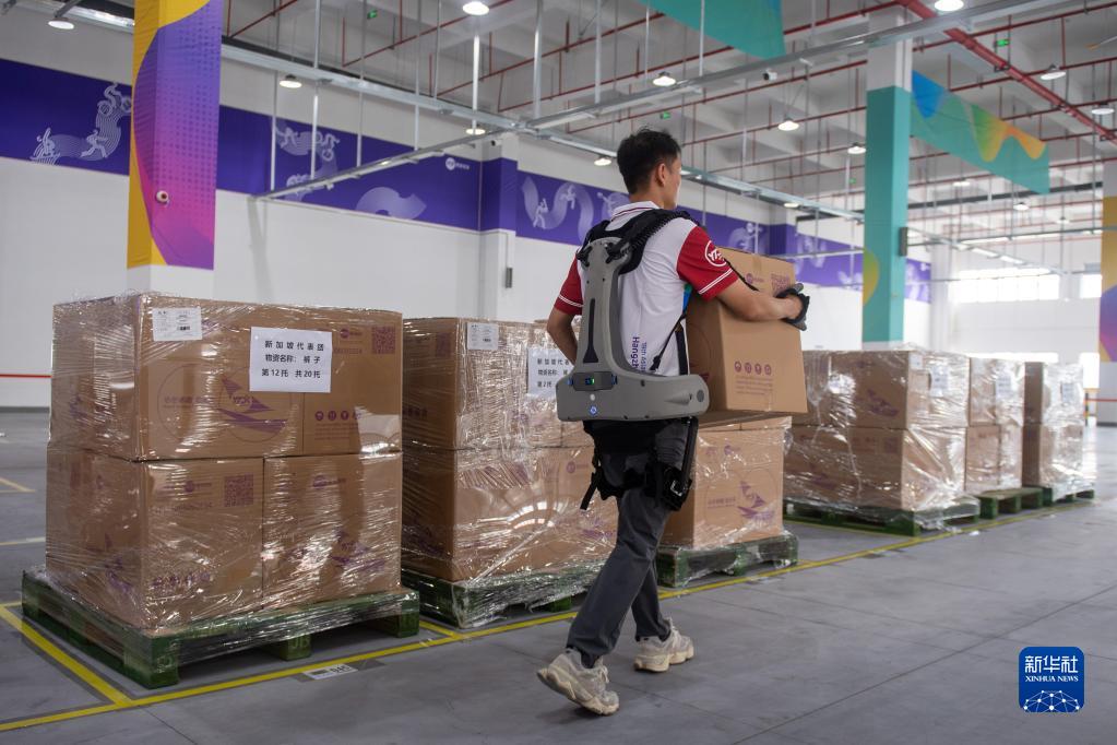 杭州亚运会物流中心的工作人员使用外骨骼机器人辅助搬运包裹。新华社