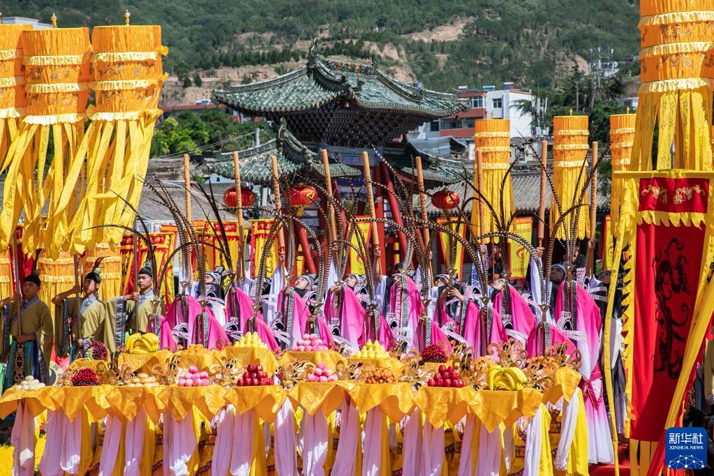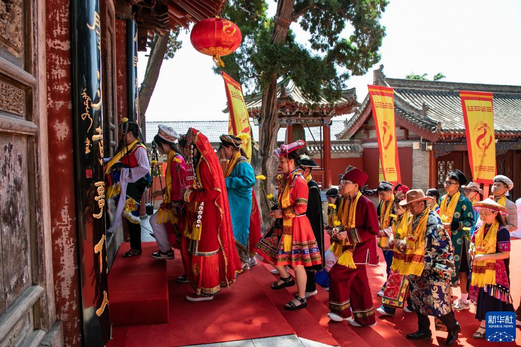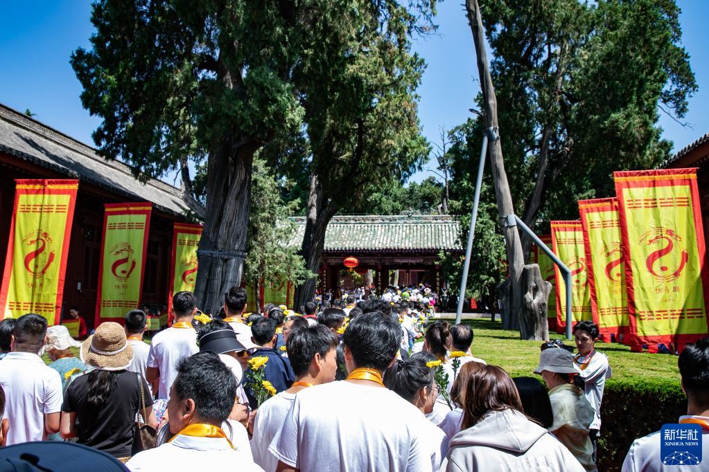6月22日,人们参加完公祭伏羲大典后进入伏羲庙内献花拜祖。新华社