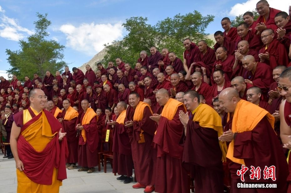 近日,中国全国政协常委、中国佛教协会副会长、中国佛协西藏分会会长班禅额尔德尼·确吉杰布在位于拉萨的西藏佛学院为广大僧尼举行“十三尊大威德金刚”灌顶仪式,并前往哲蚌寺礼佛朝拜、解经释教。图为7月2日,班禅与西藏佛学院僧尼合影,受到热烈欢迎。中新网