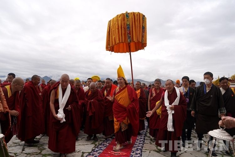7月4日,班禅来到拉萨市哲蚌寺礼佛朝拜、解经释教,这是班禅首次来到哲蚌寺礼佛朝拜。图为班禅在僧众簇拥下走向大殿。中国西藏网