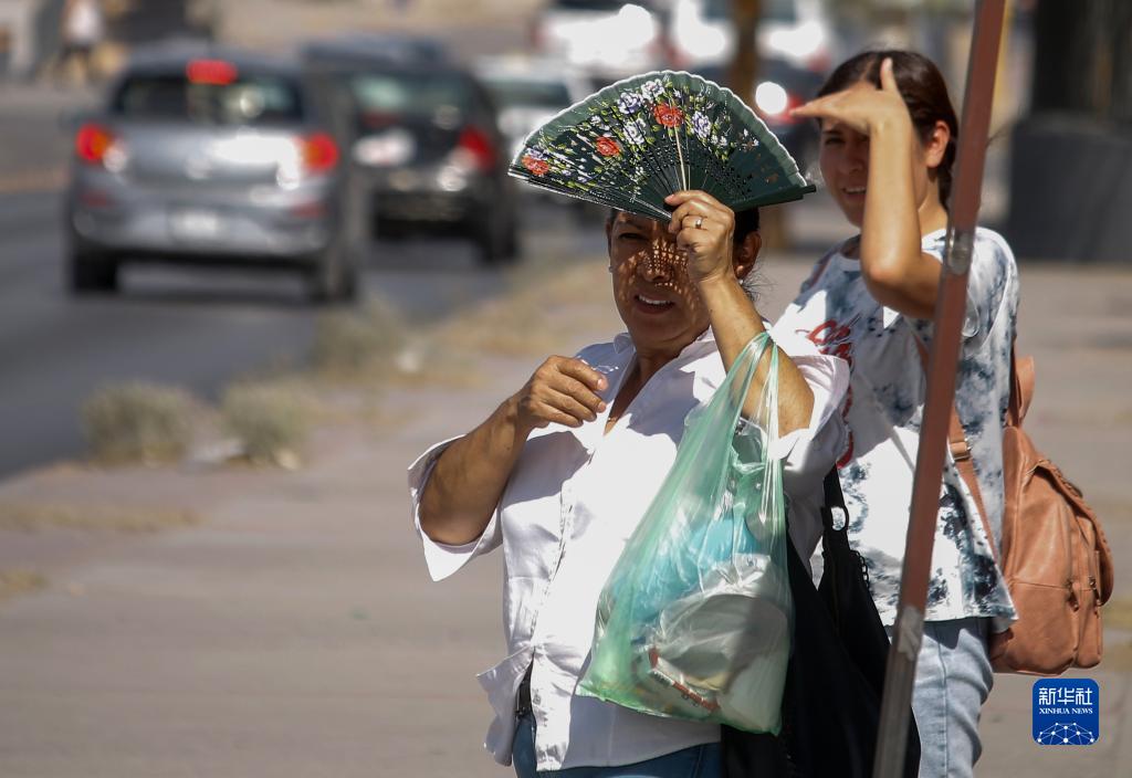 7月7日,一名女子拿着扇子站在墨西哥华雷斯城街头。新华社