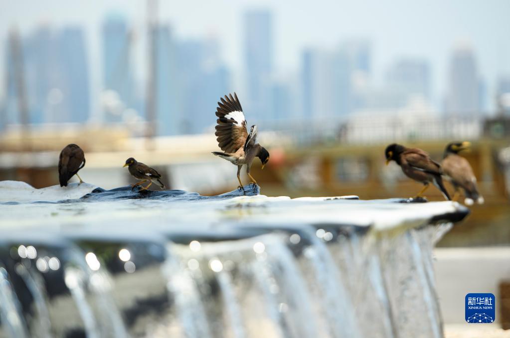 7月6日,在卡塔尔多哈,鸟群在喷泉处纳凉。新华社