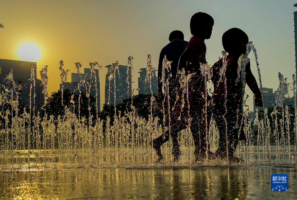 7月6日,在卡塔尔多哈,儿童在喷泉戏水纳凉。新华社