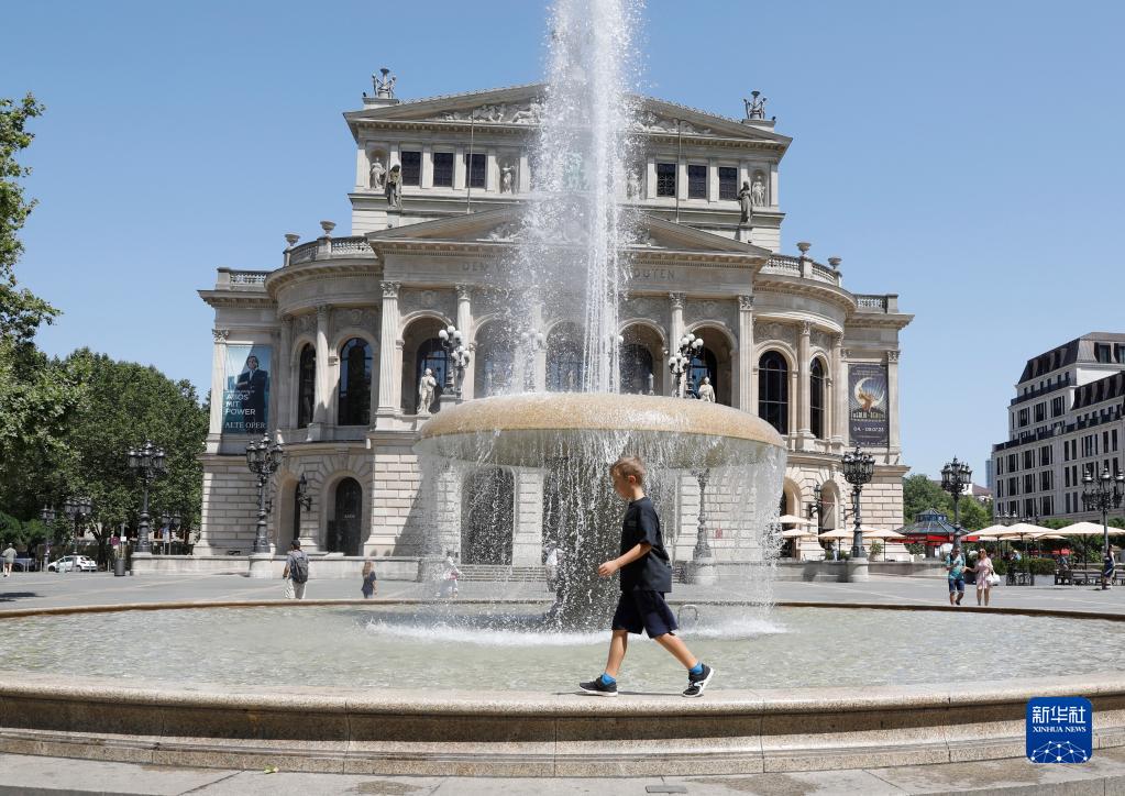 7月8日,一名男孩在德国法兰克福老歌剧院前的一处喷泉玩水。新华社