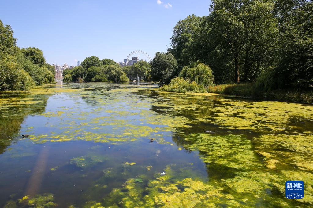 7月7日,由于气温升高,英国伦敦圣詹姆斯公园湖中绿藻泛滥。当日,英国气象局向英格兰六个地区发布了高温黄色预警,包括伦敦和约克郡等地。新华社