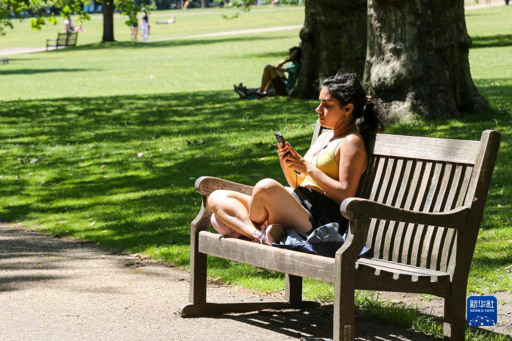 7月7日,一名女子在英国伦敦圣詹姆斯公园沐浴阳光。新华社