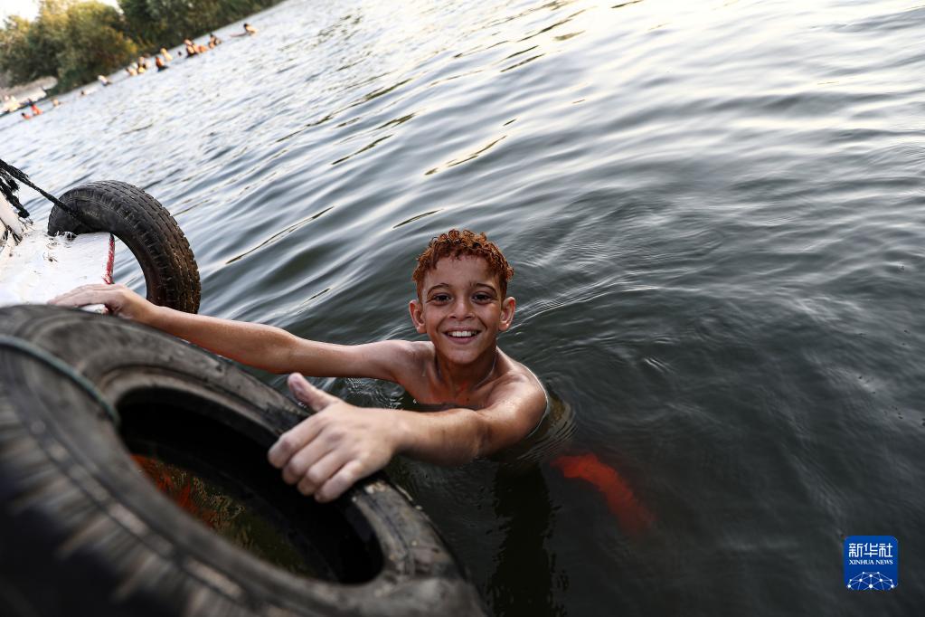 近日,埃及持续迎来高温天气。图为7月8日,在埃及盖卢比尤省,一名男孩在尼罗河里戏水避暑。新华社
