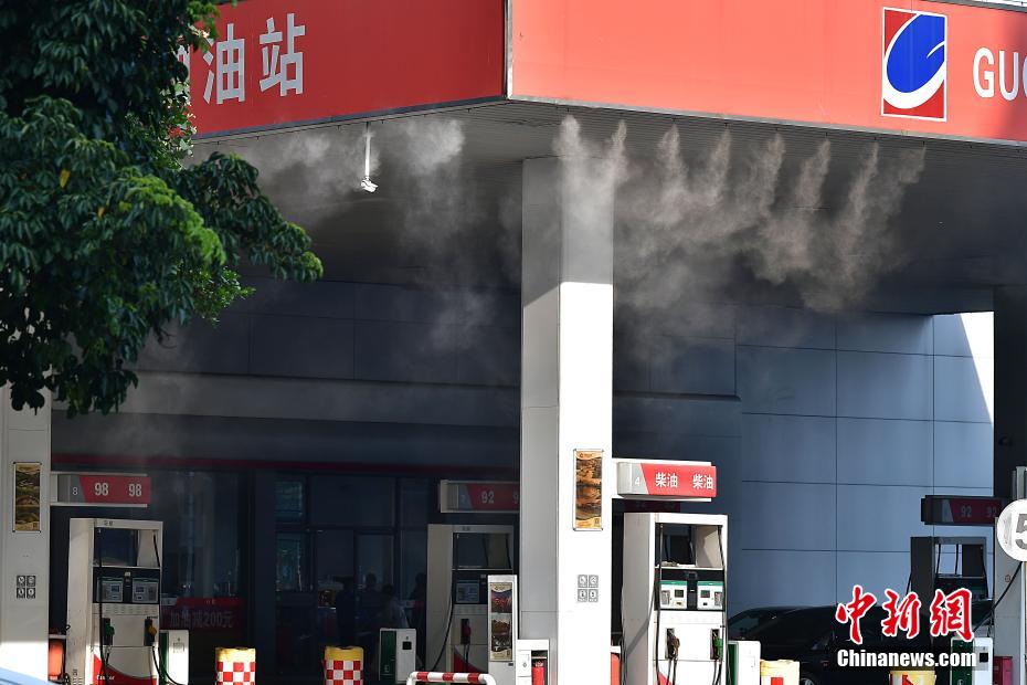 7月8日,中国福建省福州市区乌山国家气象站气温达到40.0℃,为本年度第一次突破40℃,并创下历史最早40℃纪录。图为7月8日,福州城区一加油站开启喷水雾装置降温。中新网