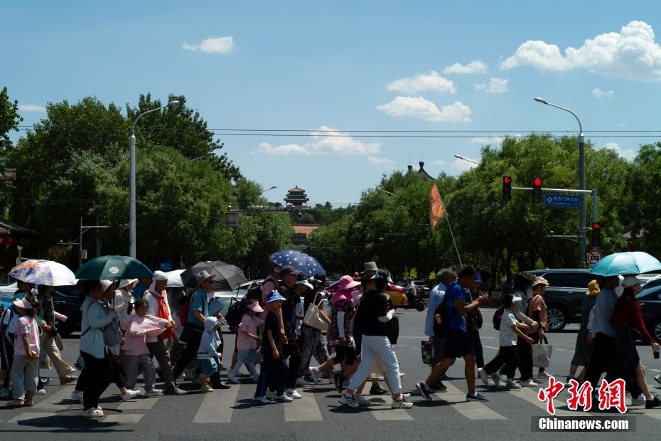 7月9日,游客行走在烈日下的北京街头。当日,北京市气象台继续发布高温橙色预警信号。中新网