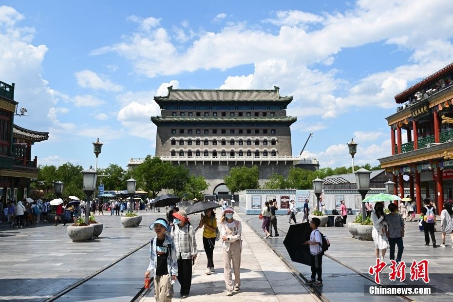 7月9日,高温天气下,游客在北京前门步行街游览。7月以来,北京天气炎热,35℃以上的高温天气频繁出现。中新网