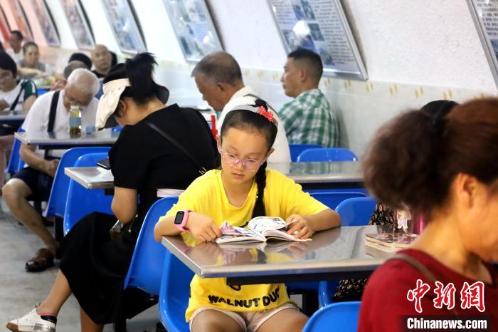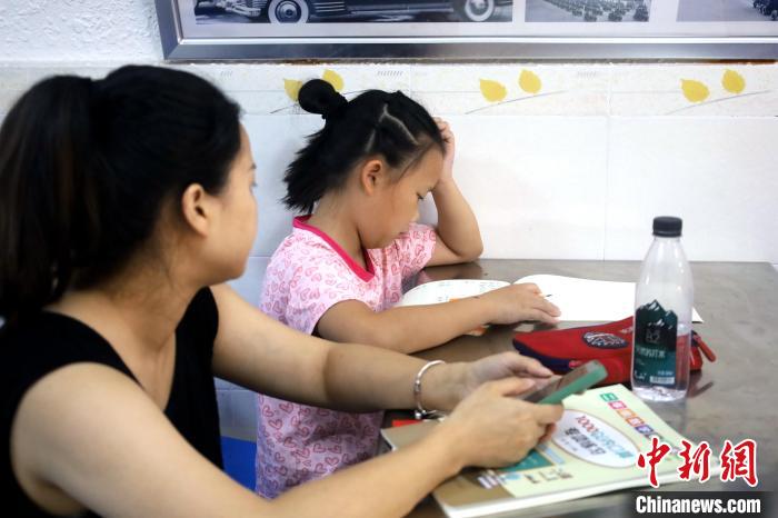 据了解,成都一号防空洞修建于1965年,是成都市已建的最早的公共人防工程,建筑面积1091平方米。为了不断提高市民安全感、体验感,在防空洞内增设了通风换气设备、饮水机、报刊架,配备了应急医用药箱,为市民提供一个安全、整洁、有序、和谐的避暑休憩场所。图为防空洞内一位家长在给孩子辅导作业。中新网