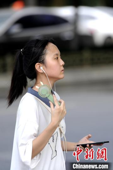 7月10日,西安市气象台继续发布高温橙色预警信号,白天新城区、碑林区、莲湖区等地区的大部分地方最高气温据预报升至37℃以上,其中未央区、阎良区、高陵区、临潼区局地升至39℃以上。图为市民手持电风扇降温。中新网