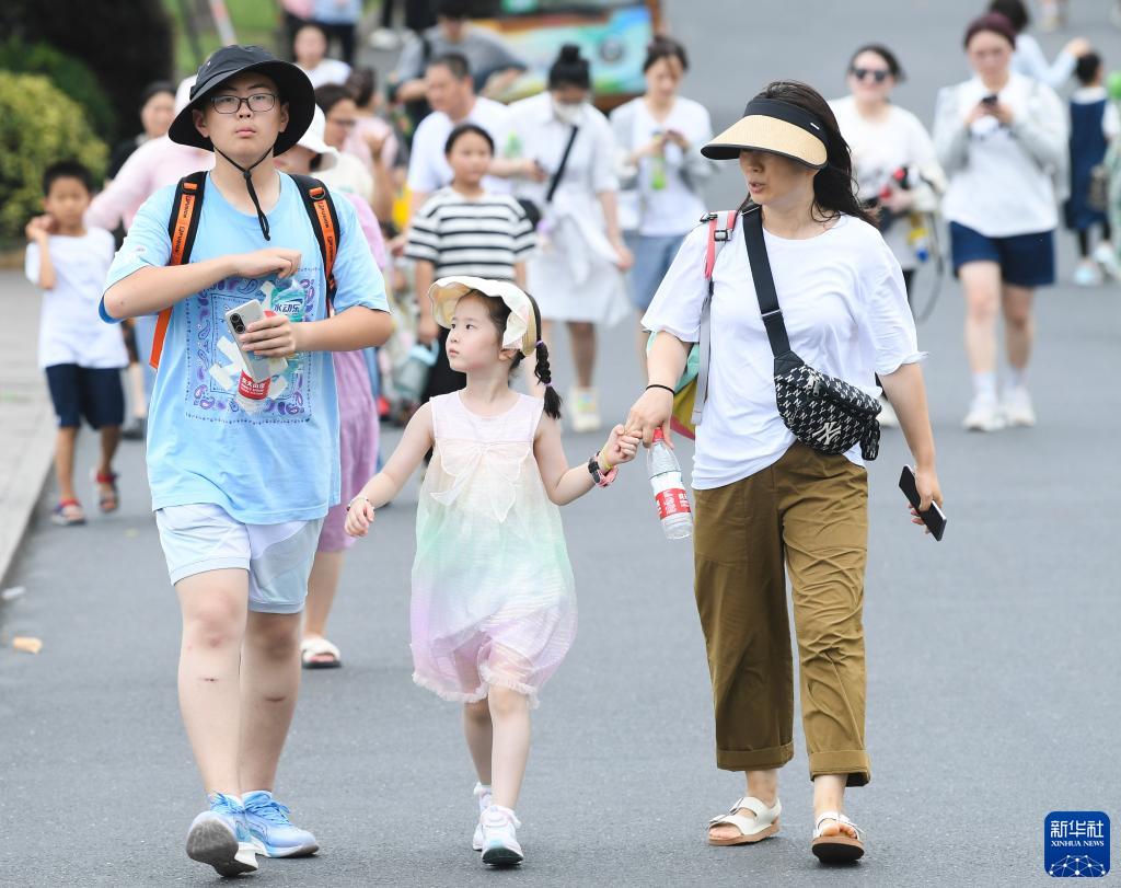 7月10日,在杭州西湖景区,一位母亲手持两个风扇和女儿游玩。新华社
