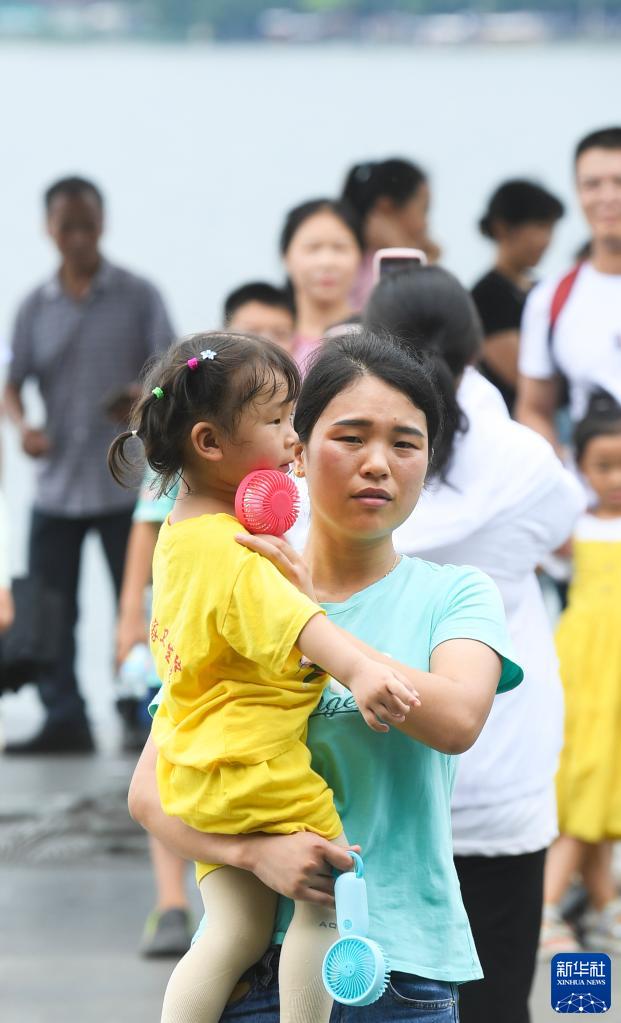 近日,浙江省多地持续晴热天气。据浙江省气象台7月10日11时发布的高温报告,受副热带高压影响,近期浙江省将延续高温天气,局部可达40℃。图为7月10日,游人在杭州西湖景区观光。新华社