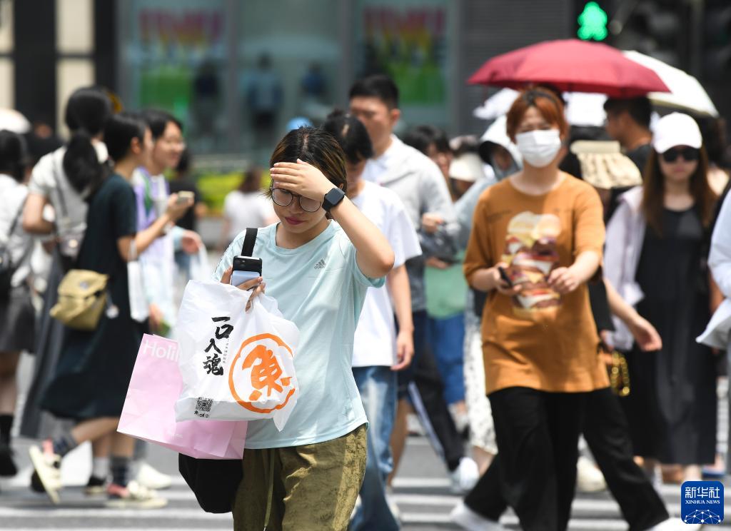 7月10日,行人在杭州湖滨商圈过马路。新华社