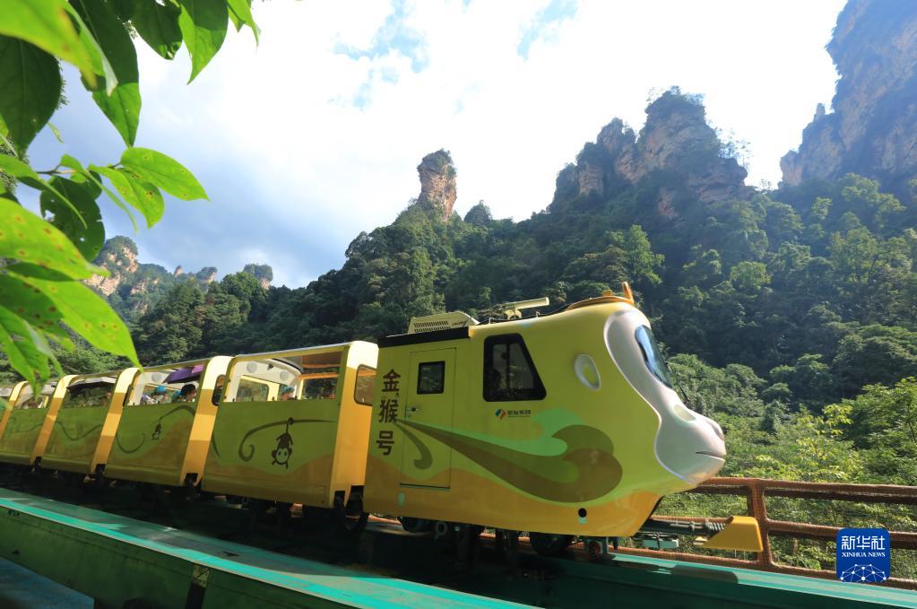 7月10日,游客乘观光电车在张家界中国国家森林公园十里画廊游览。新华社