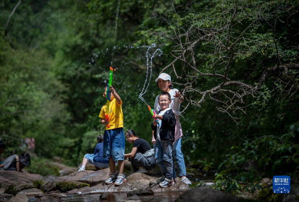 夏日,位于中国宁夏南部的六盘山国家森林公园吸引诸多游客前来避暑休闲。六盘山被誉为“黄土高原上的绿岛”,夏季平均气温18℃左右,成为游客青睐的避暑旅游目的地。图为7月8日,家长带着孩子在六盘山国家森林公园玩耍。新华社