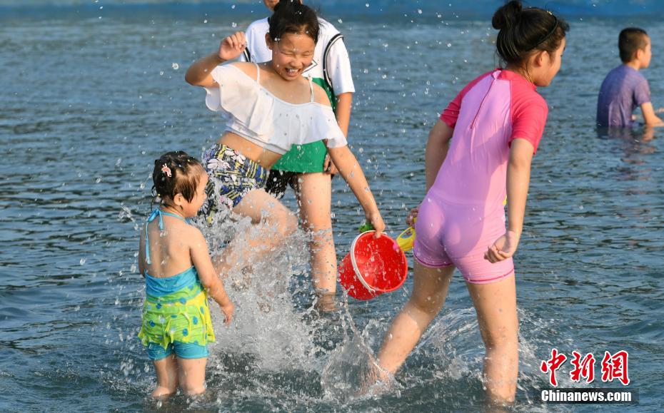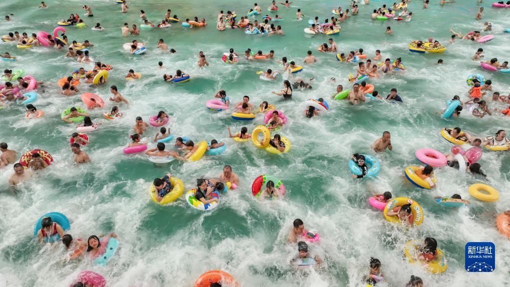 7月10日,游客在四川省遂宁市大英县一旅游度假区戏水(无人机照片)。新华社