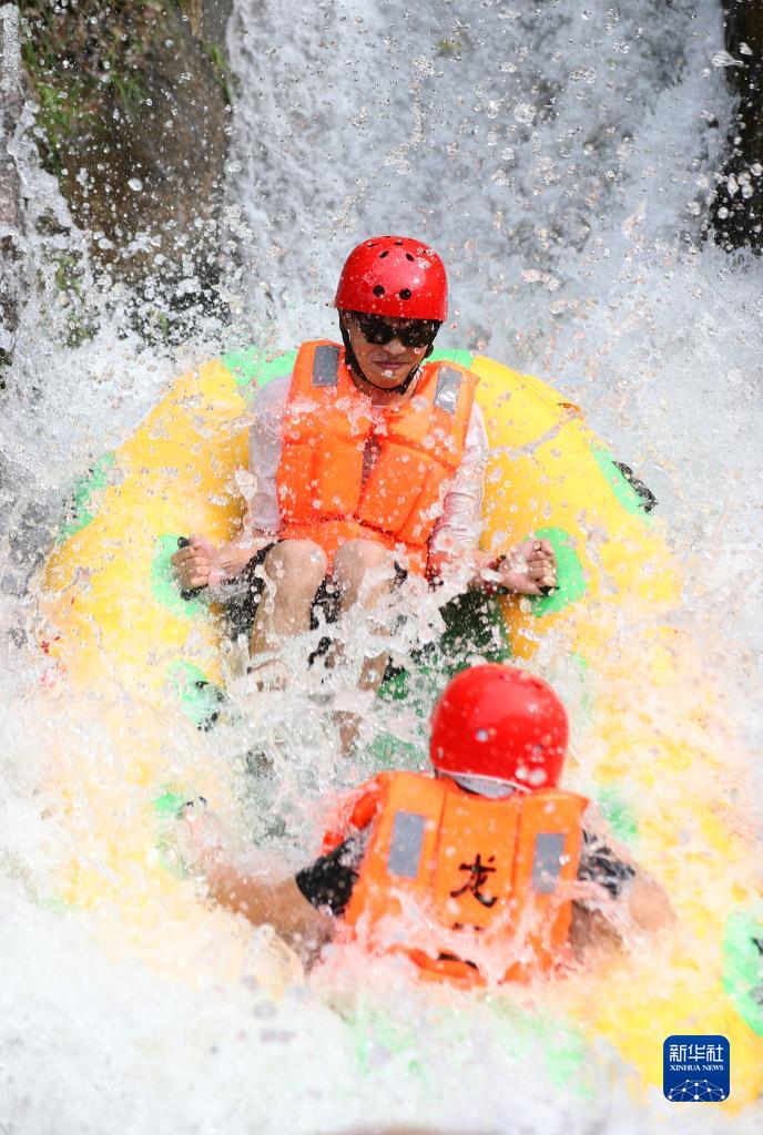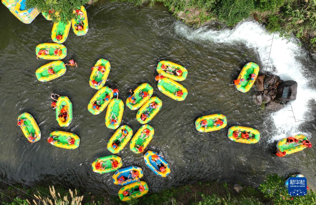 7月10日,湖南省衡阳市衡阳县金兰镇联龙村,游客在龙王峡漂流戏水。新华社