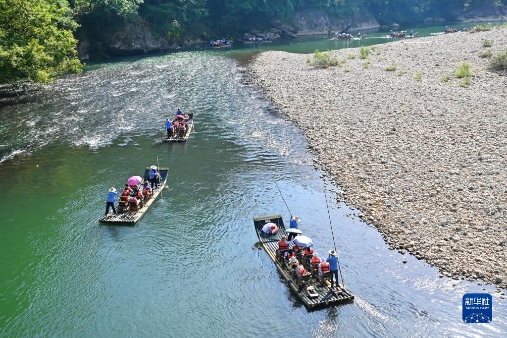 7月10日,在福建武夷山国家公园,游客乘竹筏漂流。新华社