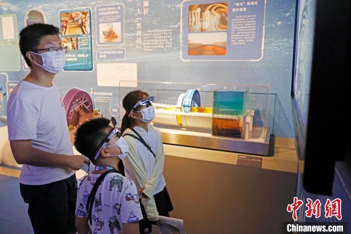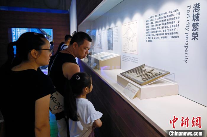 市民带着孩子在上海市历史博物馆内,观看“江海撷珍—长江口二号科学考古进行时”展览。中新网