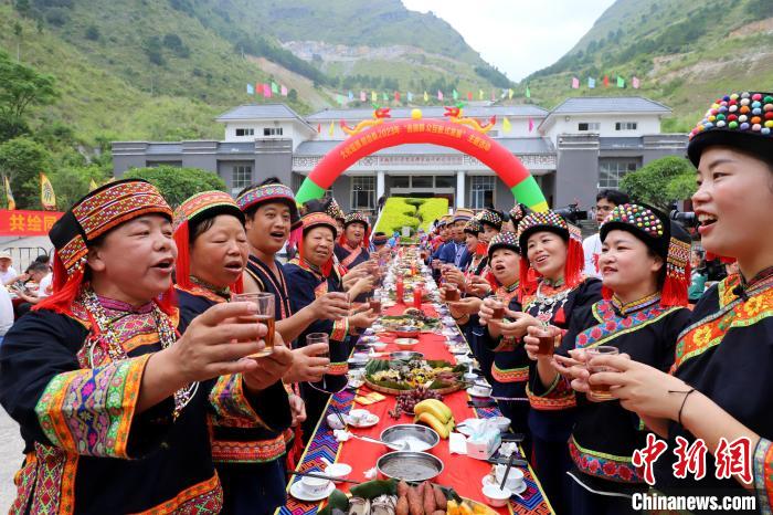 连日来,大化县举办2023年布努瑶“祝著节”庆祝活动,开展传统民族体育竞技、民族风情表演等丰富多彩的民俗活动,展示当地特色民族文化,促进各民族交往交流交融。图为民众聚在一起吃“民族团结饭”。中新网