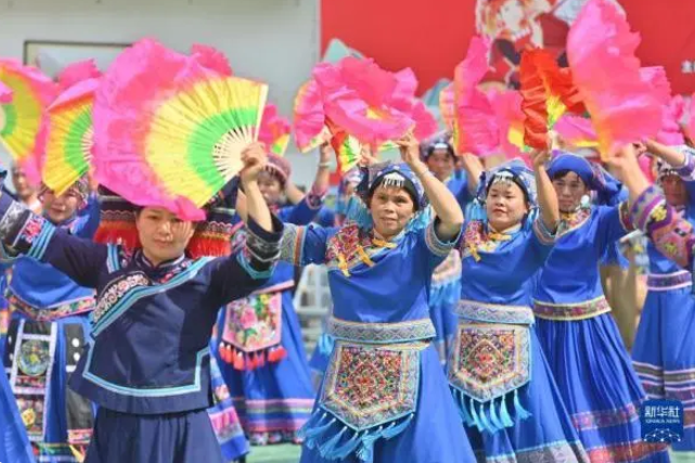 近日,广西大化瑶族自治县的各族群众欢聚一堂,通过打陀螺、跳民族舞蹈、射弩等丰富多彩的民间文娱活动,欢庆一年一度的传统节日——“祝著节”。图为7月11日,在大化瑶族自治县仁良村,村民在陀螺文化展演活动中跳陀螺舞。新华社