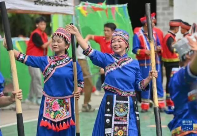 7月11日,在大化瑶族自治县仁良村,村民跳糍粑舞。新华社