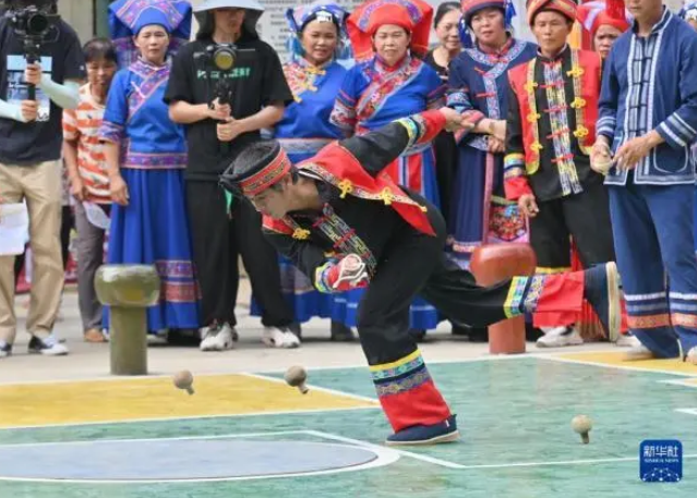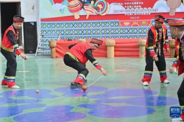 7月11日,在大化瑶族自治县仁良村,村民在陀螺文化展演活动中打陀螺。新华社