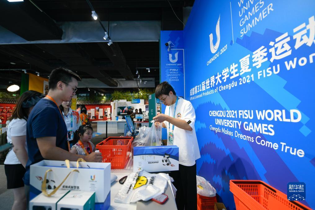7月13日,工作人员和媒体记者在成都大运会主媒体中心官方特许商品零售店选购商品。新华社