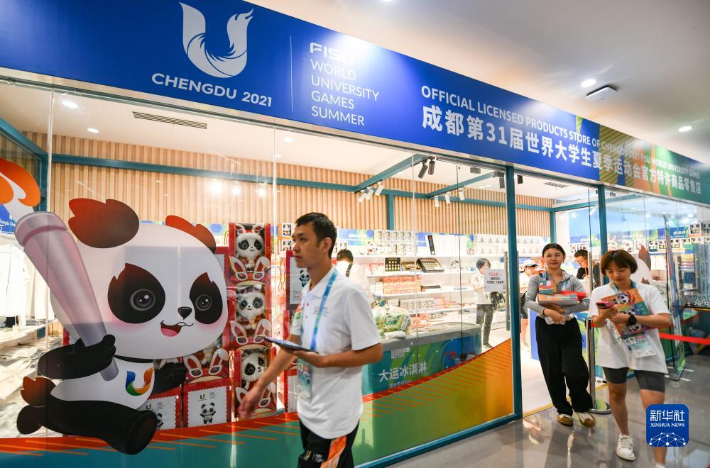7月13日,在成都大运会主媒体中心大运会官方特许商品零售店,媒体记者和工作人员选购商品后离开。新华社