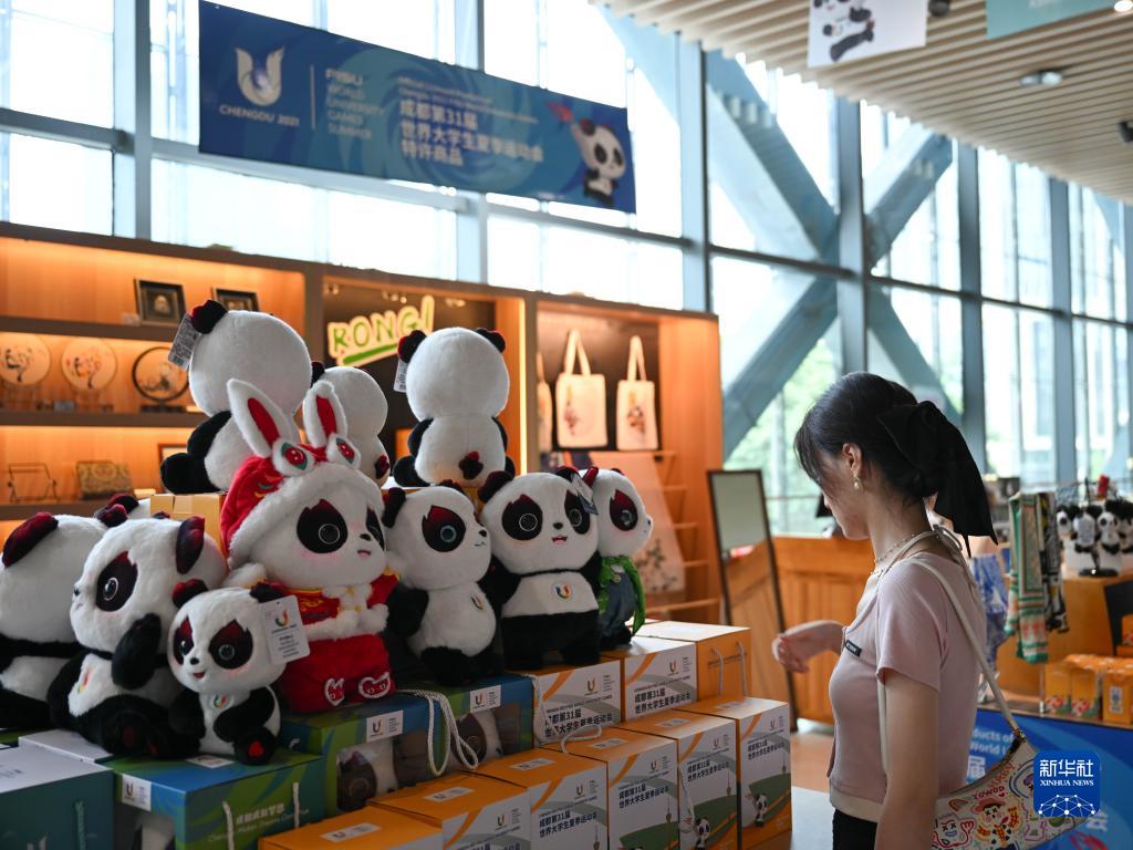 7月18日,市民在成都大运会成都博物馆官方特许商品零售店内选购“蓉宝”公仔。新华社