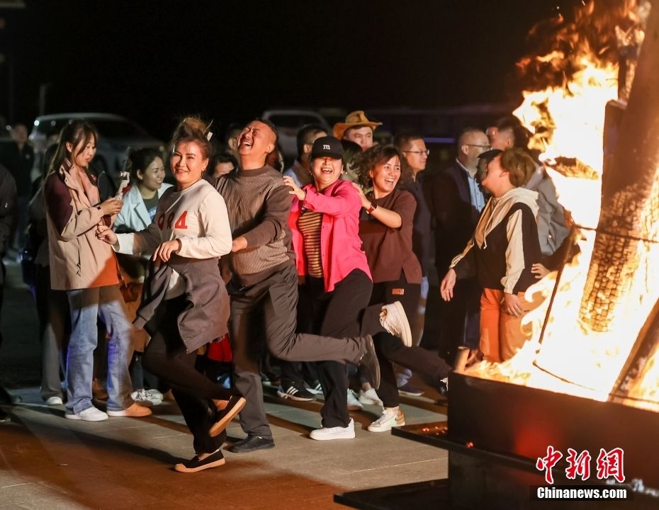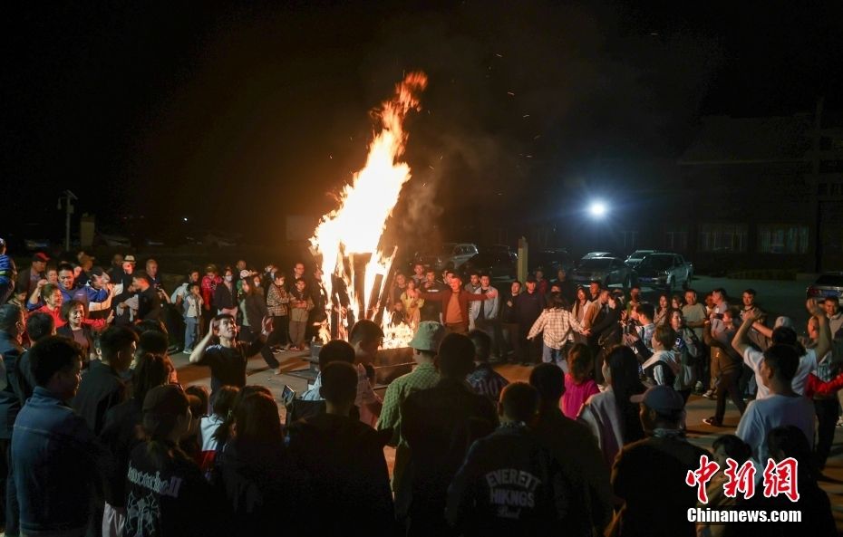 7月18日,新疆哈密巴里坤鸣沙山下的篝火晚会热闹欢快。中新网