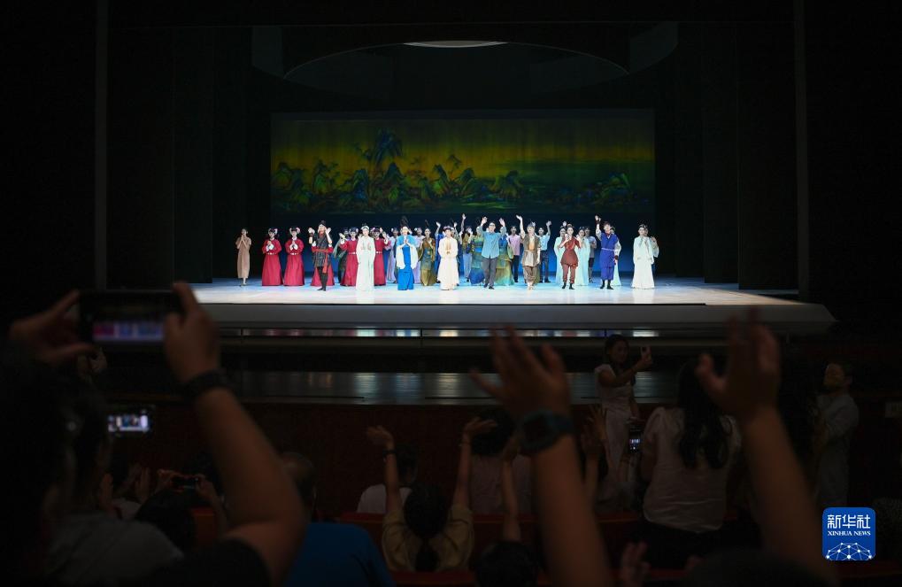 7月20日,中国东方演艺集团演员在乌鲁木齐文化中心大剧院表演舞蹈诗剧《只此青绿》。谢幕后,观众拍照留念。新华社