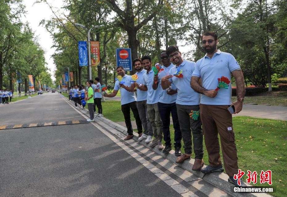 电子科技大学的外国留学生为火炬传递加油。中新网