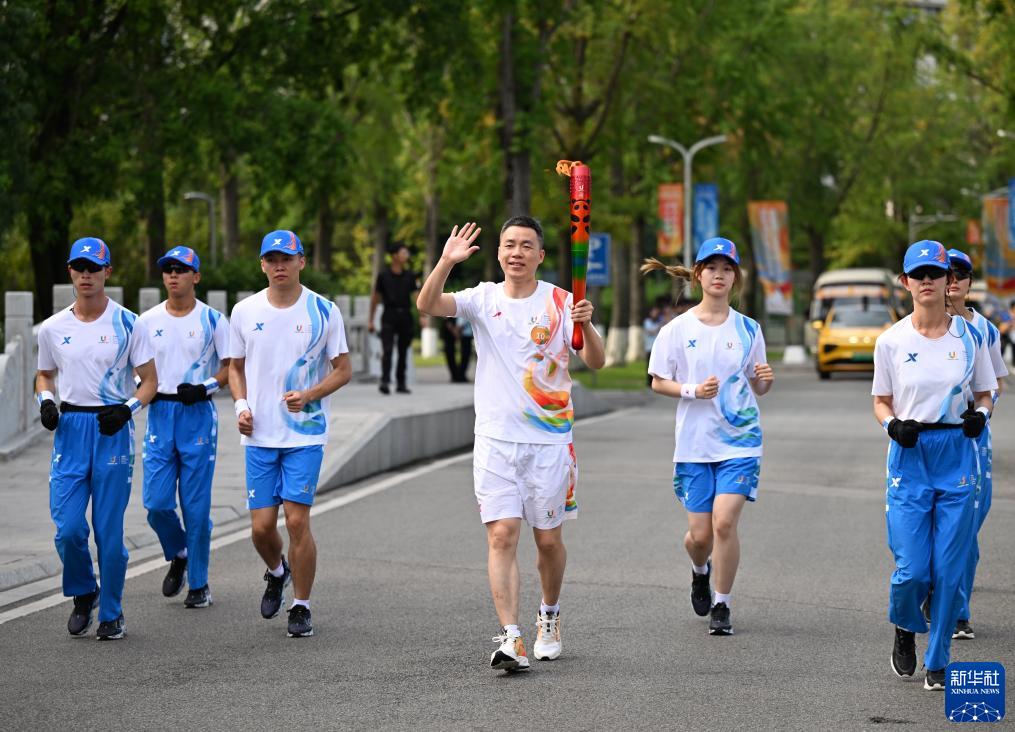 7月20日,火炬手颜一正在火炬传递中。新华社